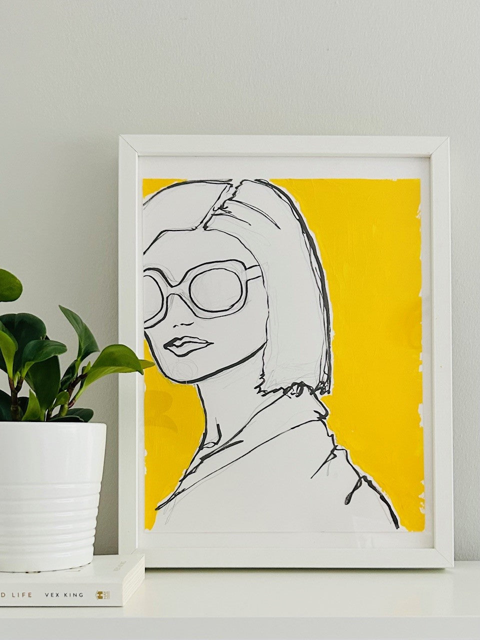 As part of the Pop Art Pop Up Collection, the character and personality of this print is represented in the appearance of both pencil and ink lines, as well as a very textured and sometimes unevenly coloured background that was created on the original by mixing acrylic and gouache paint directly on the paper without water. The spontaneity of this process created the desired effect of texture, uneven pigmentation, and slight cracking in some areas. These details are expected to be seen in the print.